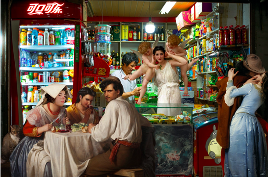Here the subjects all congregate within a train setting and re-evaluate the idea of ‘rush hour’.  In aiming for a kind of realism, I hope to draw the viewers’ attention to the various details and changes with the work. The message behind the work to convey what I believe these classical characters would be doing if placed within a modern setting. I have presented the subjects to be participating in mundane tasks like working the counter, casual dinner with friends and displays of public affection – all occurrences we find in the real world every day. I wanted to take away their ‘status’ of fame and transition into ordinary people; in hopes that the viewers are able to relate better to the subjects.