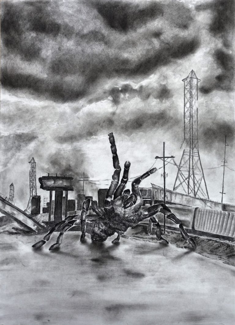 Post Humanism: Attack of the Giant Tarantulas Description This drawing was completed over the course of two weeks, after spending weeks researching different insects both from my garden and the internet. The aim of the project was to create a post-human world; which allowed the animal kingdom – especially insects – to ‘take-over’. The main inspiration for this piece was one of my favourite B-rated films ‘Eight-Legged Freaks’. Details Series Post Humanism MediumCharcoal SizeA1 Date15th June 2020 Ready to start a project? Drawing with Schlimazel Drawing PreviousNext